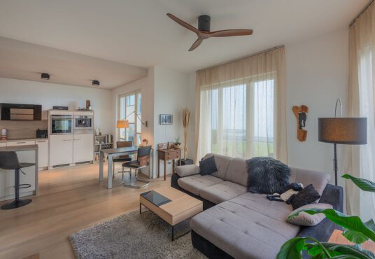 Die Wohnung selbst präsentiert sich hell, großzügig und sofort nutzbar. Herzstück ist der offen gestaltete Wohn-, Ess- und Küchenbereich, der durch seine angenehme Weite, die hohen Decken, den schönen Lichteinfall und die klare Raumstruktur überzeugt. Die moderne, voll integrierte Einbauküche fügt sich harmonisch in das Wohnkonzept ein und schafft gemeinsam mit der geschmackvollen Möblierung ein sofort einladendes Wohnambiente. Das Schlafzimmer ist ebenfalls sehr gut geschnitten, ruhig wirkend und bietet neben dem Bett- und Schrankbereich auch Platz für einen Arbeitsbereich. Ergänzt wird das Raumangebot durch ein zeitgemäß ausgestattetes Duschbad mit klarer, gepflegter Gestaltung.